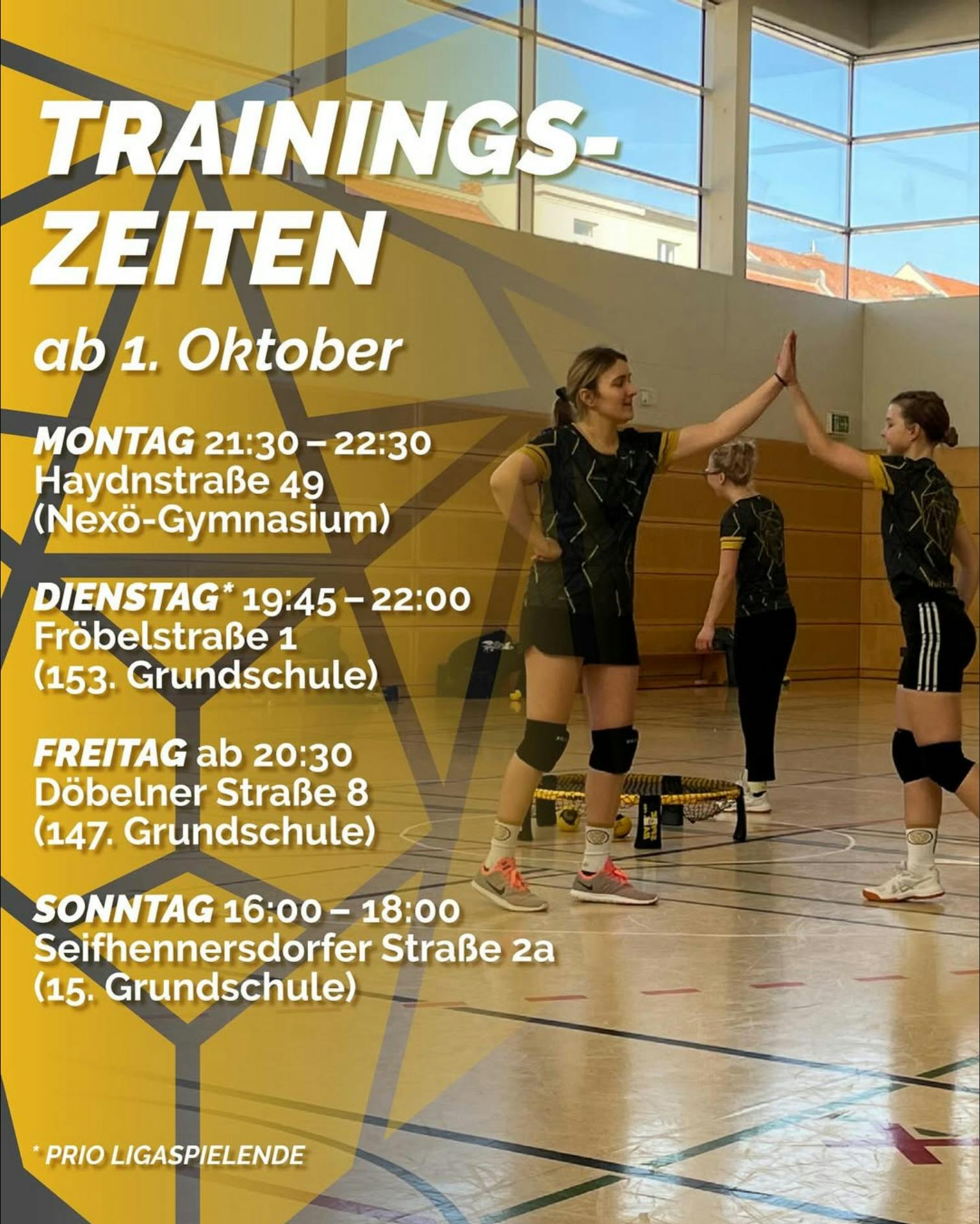 *Ligatraining: Da die Halle klein ist und maximal drei Netze rein passen, wird diese zum Großteil für das Einspielen der Mannschaften der Regionalliga, 1. und 2. Bundesliga genutzt.